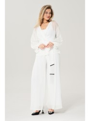 Элегантный вечерний костюм-двойка из шифона, состоящий из блузки свободного кроя и широких брюк.