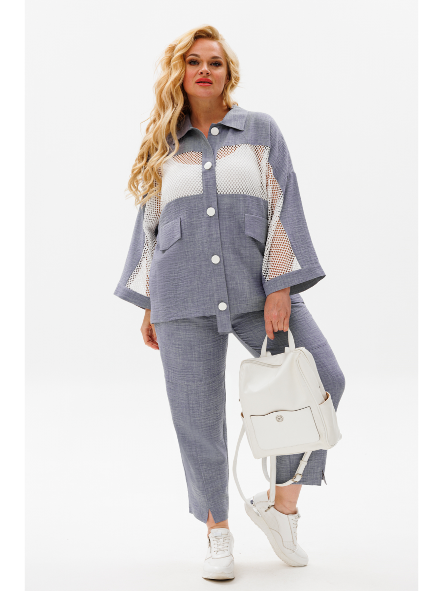 Блузка прямого силуэта со спущенным плечом. Застежка на планку, петли и пуговицы. По полочке спинке и рукову- вставки из трикотажного полотна "сетка". Воротник стояче-отложной. По полочке идет карман клапан-обманка. По низу рукова-бейка.
