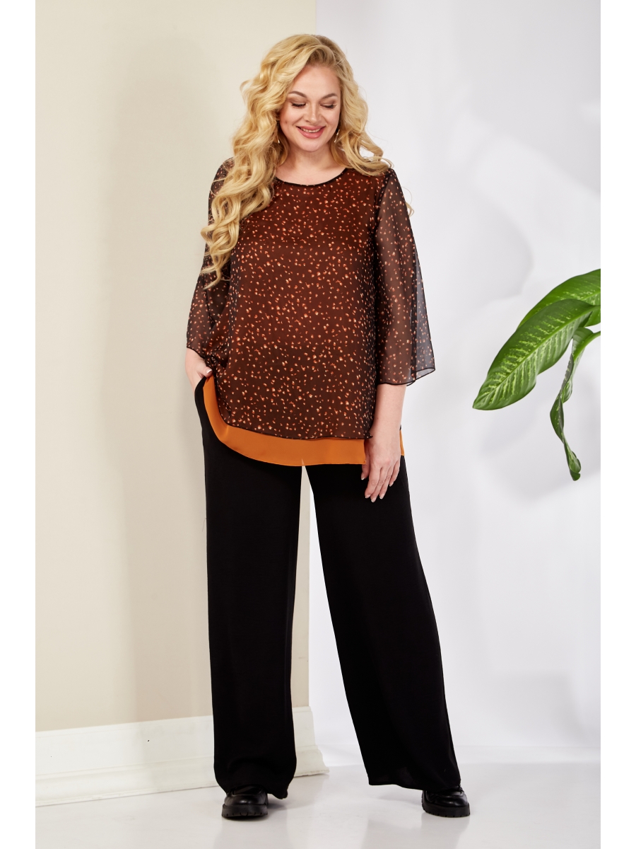 Блузка двойная из 2-х видов шифоновой ткани (цветная и однотонная), трапециевидного силуэта. Рукав 3/4 длины. В качестве декора - логотип фирмы по низу блузки.