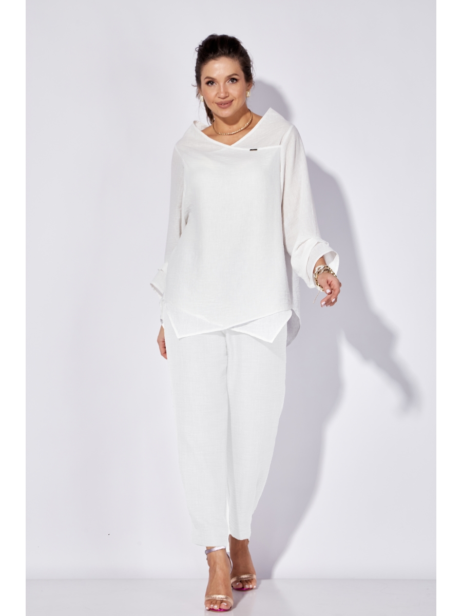 Блузка женская из текстильной ткани. Модель прямого силуэта, рукав углублённый, рубашечного типа. Перед идет с запахом, низ блузы ассиметричный, по полочке углы, спинка закруглённая, удлинённая. По рукаву идут защипы. В качестве декора-логотип фирмы на горловине.