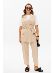 Жилет полуприлегающего силуэта: бочок с выточкой по полочеке, по спинке средний шов. Застежка двухбортная, карман клапан "обманка". Воротник пиджачного типа. В качестве декора по борту термо наклейка в виде надписи, по клапану-нашивка.