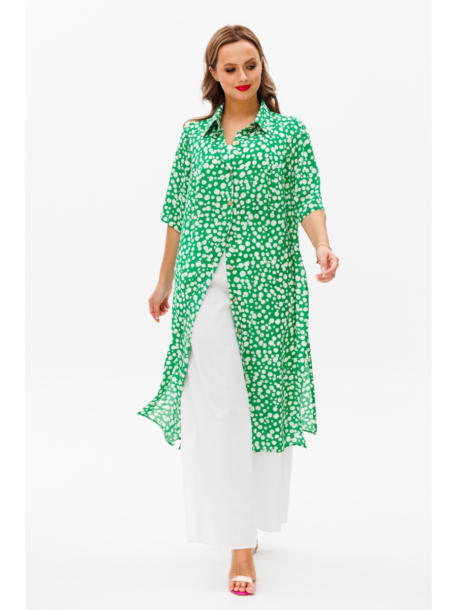 Блузка длинная, прямая. По переду нагрудные выточки с проймы. По боковым швам разрезы. Воротник на отрезной стойке, застежка планка на петеле и пуговицы. Рукав втачной одношовный.