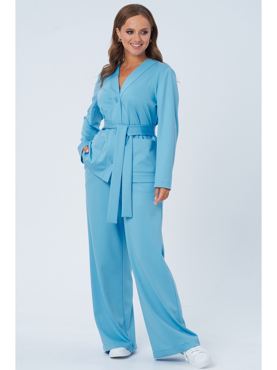 Эффектный брючный комплект из трикотажного полотна состоит из прямого жакета и широких брюк.