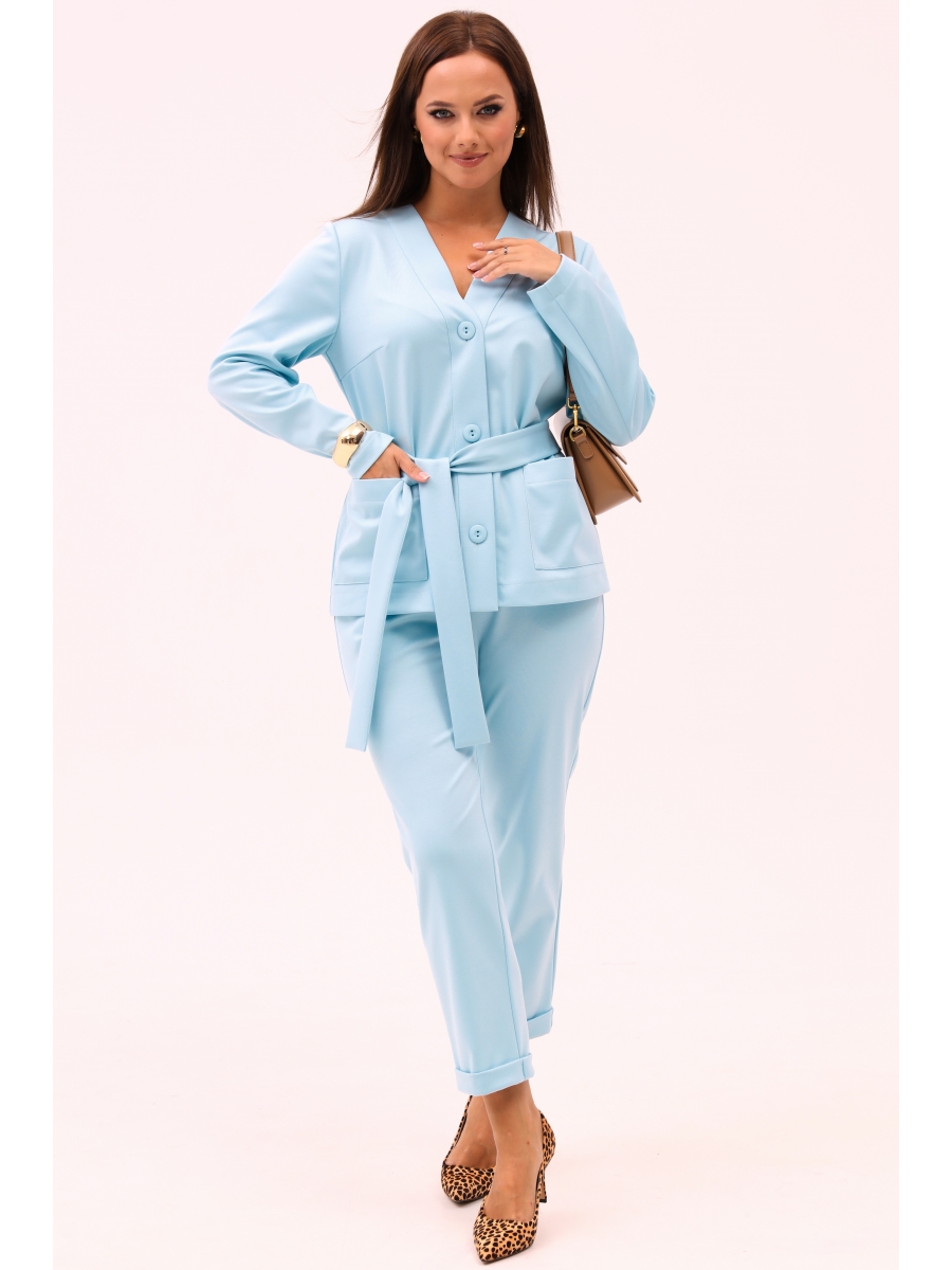 Стильный брючный комплект из трикотажного полотна состоит из прямого жакета и зауженных брюк. Он сочетает в себе элегантность и комфорт, что делает его подходящим как для повседневной носки, так и для работы и деловых встреч.