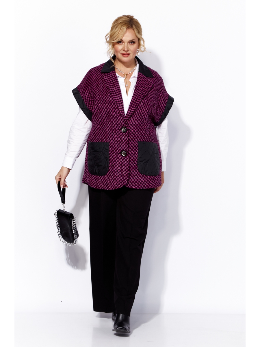 Жилет женский из польтовой буклированной ткани в клетку без подкладки. Модель прямого силуэта оверсайз. По переду клетка идет по косой. Воротник классической формы, застежка на петли и пуговицы. В качестве декора: воротник, накладные карманы и бейка проймы - из стеганной плащевой ткани.