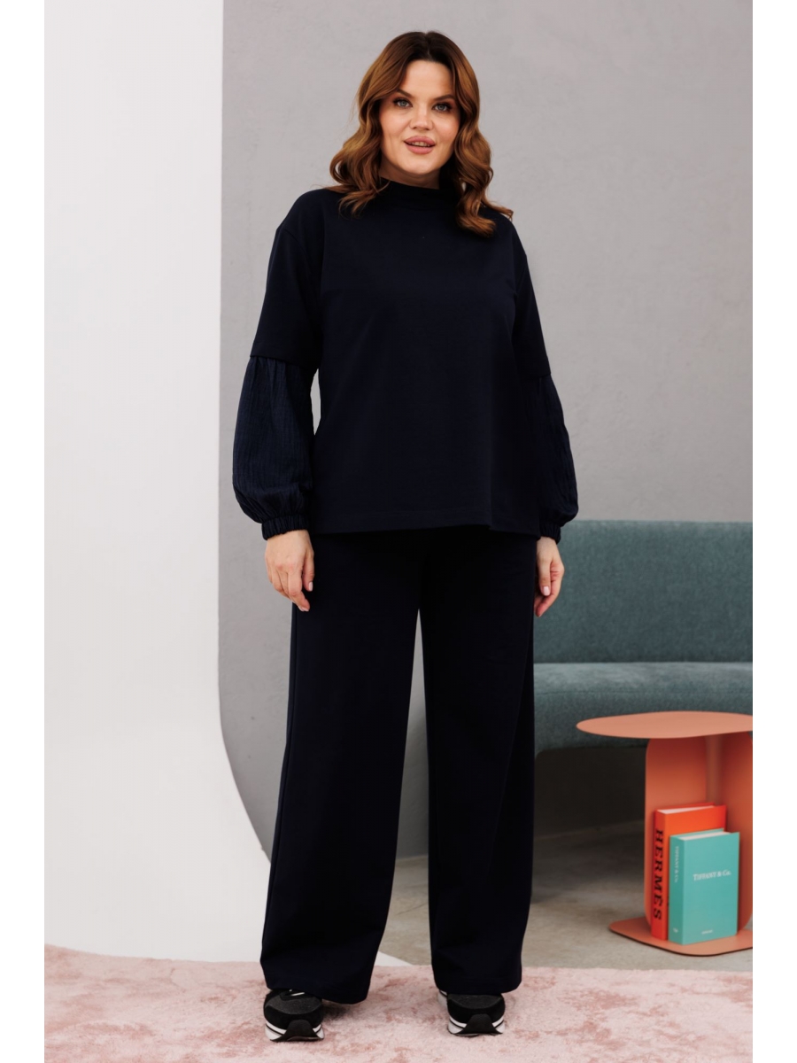 Джемпер прямого силуэта со спущенным плечом. Полочка трикотажная. По спинке идет отрезная кокетка и вставка из отделочной ткани со встречной складкой по центру, низ фигурный. Воротник - стойка. По рукаву идет подрез из отделочной ткани. Сверху по подрезу сборка, низ рукава на резинке.
