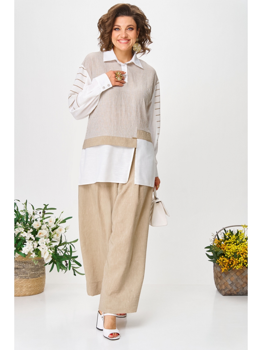 Оверсайз крой придаёт костюму особый шарм, а легкая невесомая ткань дает свободу движений. Высокая посадка и резинка по поясу подчёркивает талию и делает силуэт более изящным. Смесь натуральных материалов позволяет пропускать воздух и отводить влагу, что особенно важно в жаркую погоду и прохладное утро. Ткань не мнется.