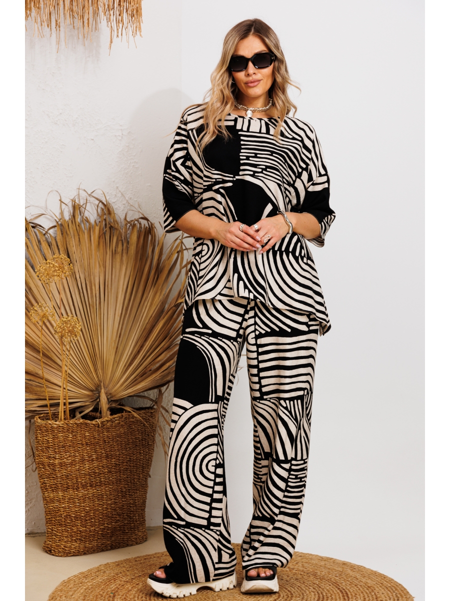 Костюм женский 2-х предметный (блузка, брюки) из текстильной ткани с абстрактным принтом станет акцентным дополнением к вашему гардеробу.