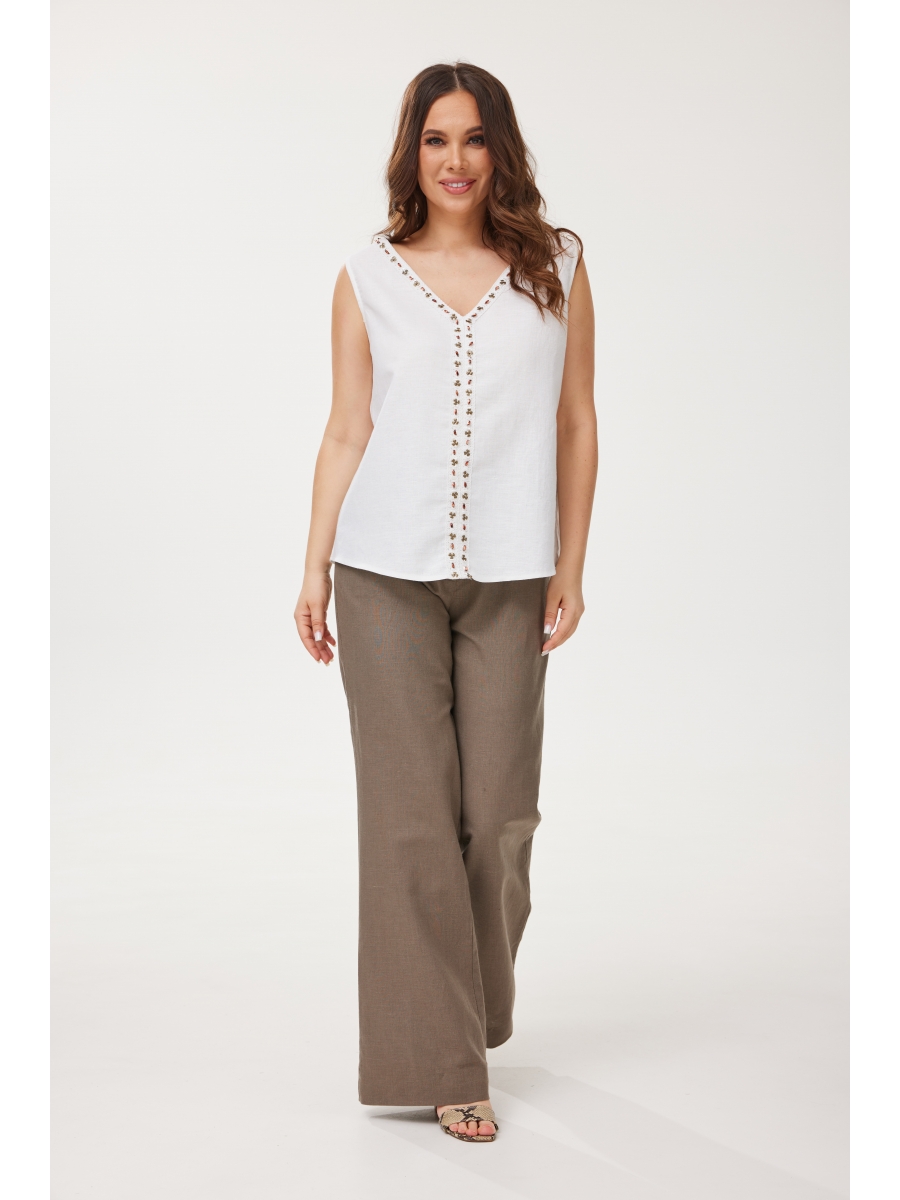 Эффектная блузка изготовлена из качественного натурального мягкого льна с эффектом мятости свободного силуэта. По переду и горловине проходит отделка - тесьма из хлопка. Низ асимметричен.