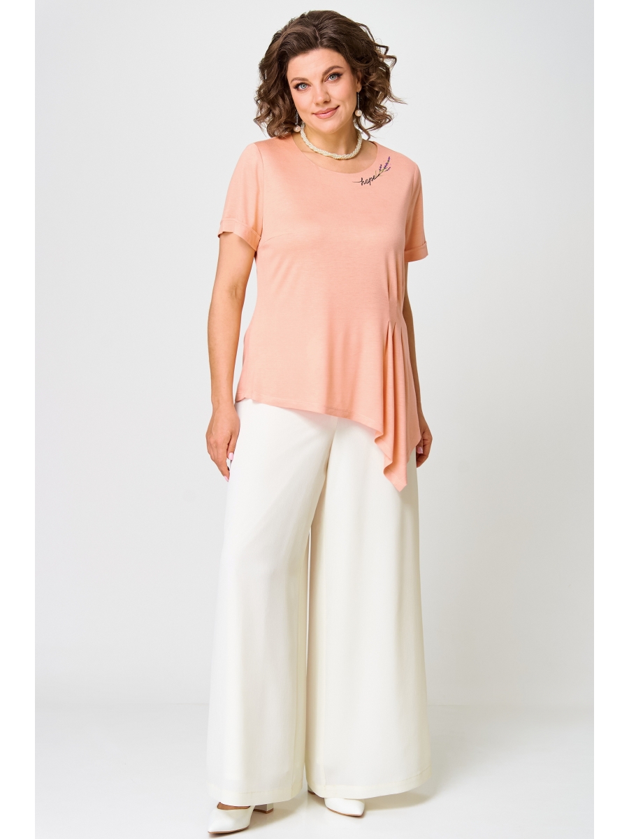 Блузка из тонкого однотонного трикотажного полотна с элегантными защипами по талии подчеркнет Вашу женственность и романтичность. Удлиненную блузку дополняют комфортные брюки свободного силуэта из струящегося шифона, которые помогут скрыть недостатки и вытянуть фигуру.