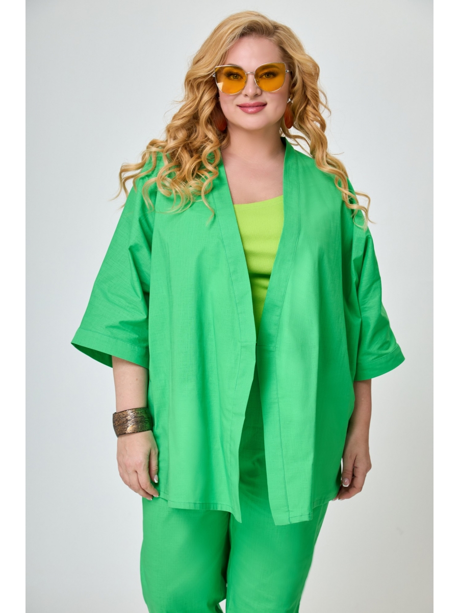 Костюм женский из льна. Кимоно оверсайз, длиной до середины бедра. Рукав 3/4, низ широкий на манжете, без застежки. По переду фигурный запах. Талию можно подчеркнуть при помощи съемного пояса или комбинировать с корсетом.