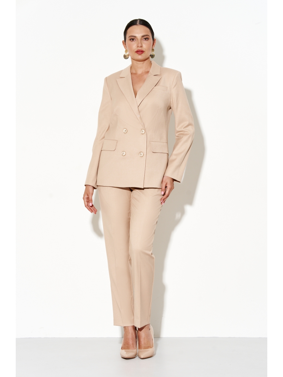 Классический комплект, представленный в трех кофейных оттенках. Комплект состоит из двубортного жакета полуприлегающего силуэта на подкладке, по переду карманы.