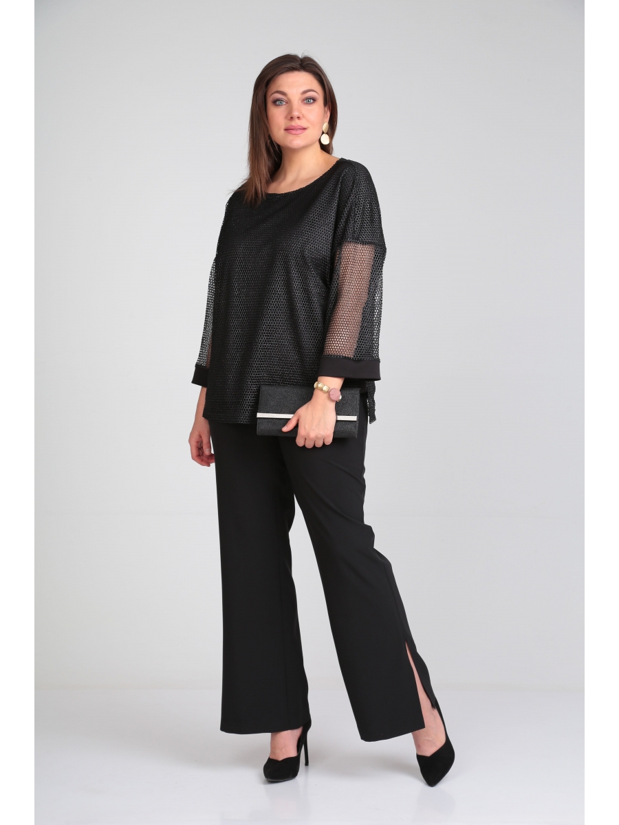 Нарядный и эффектный женский брючный комплект с джемпером свободного силуэта. Джемпер двойной - нижний слой из тонкого трикотажного эластичного материала, верхний — декоративный трикотаж -сетка, которая служит отличительной чертой данной модели. Вырез горловины — круглый, плечо спущенное с втачным рукавом ¾. В сетке по боковым швам разрезы. Брюки прямые с разрезами в боковых швах, на поясе сзади вставка — резинка, застежка молния и карманы. Изделие подойдёт на рост 170 см.