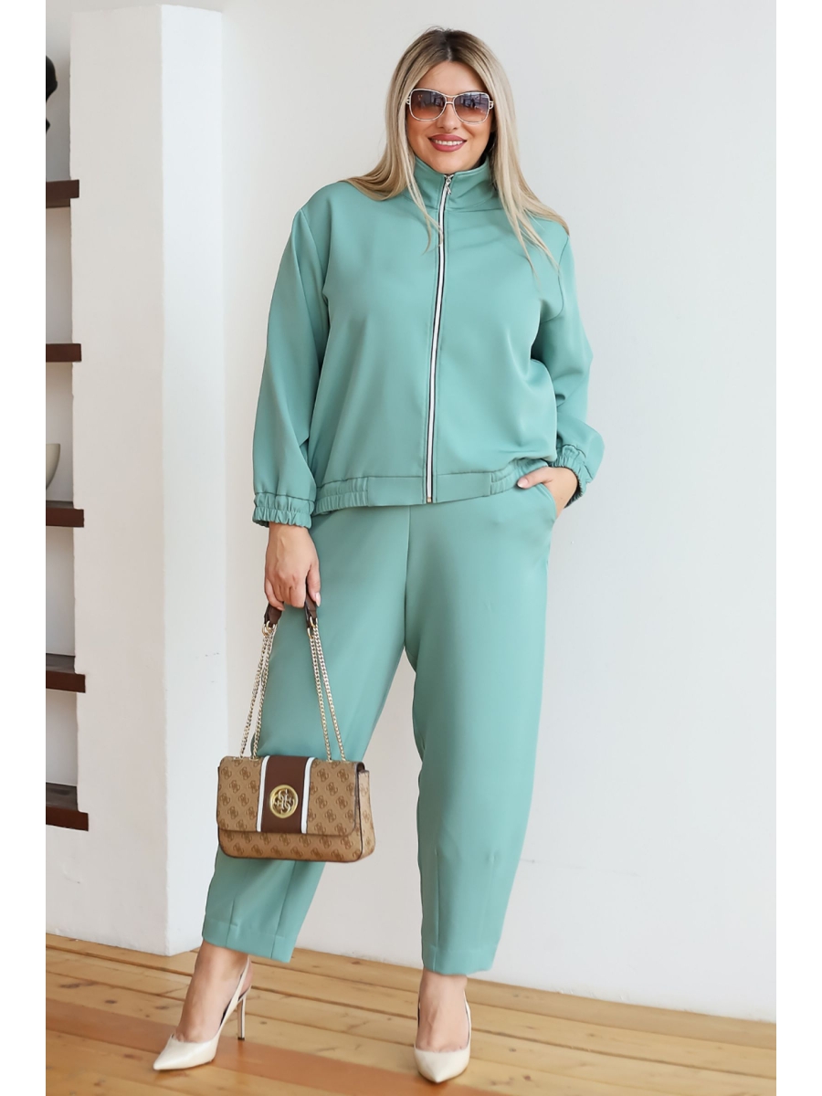 Оригинальный стильный костюм, состоящий из верха и брюк. Модель из костюмной ткани – «барби», комфортна и практична в носке. Верх прямого силуэта длиной до линии бедра, по низу дополнен широким поясом с резиной. Круглый вырез горловины оформлен воротником –стойка. По центру переда застежка молния, переходящая в воротник. В боковых швах удобные карманы. Рукав втачной длинный на спущенной линии плеча, по низу дополнен манжетой на резине. Костюм на рост 164 см.
