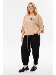 Брюки-шаровары, длиной 7/8, на притачном поясе с резинкой до центральной вставки со шнуровкой, имеются два кармана в боковых швах, по низу брюк застрочены складки и широкая подгибка.