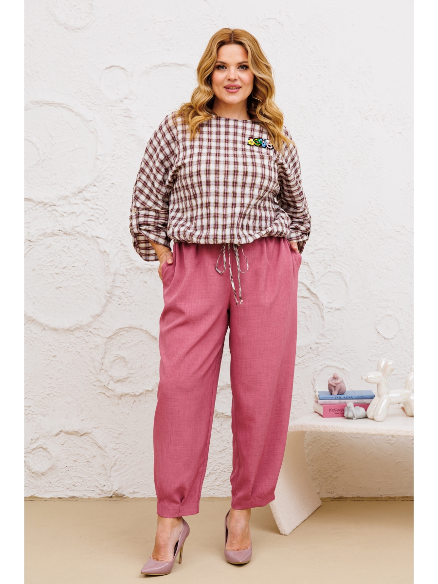 Брюки-шаровары, длиной 7/8 , на притачном поясе с резинкой до центральной вставки со шнуровкой, имеются два кармана в боковых швах, по низу брюк застрочены складки и широкая подгибка.