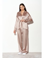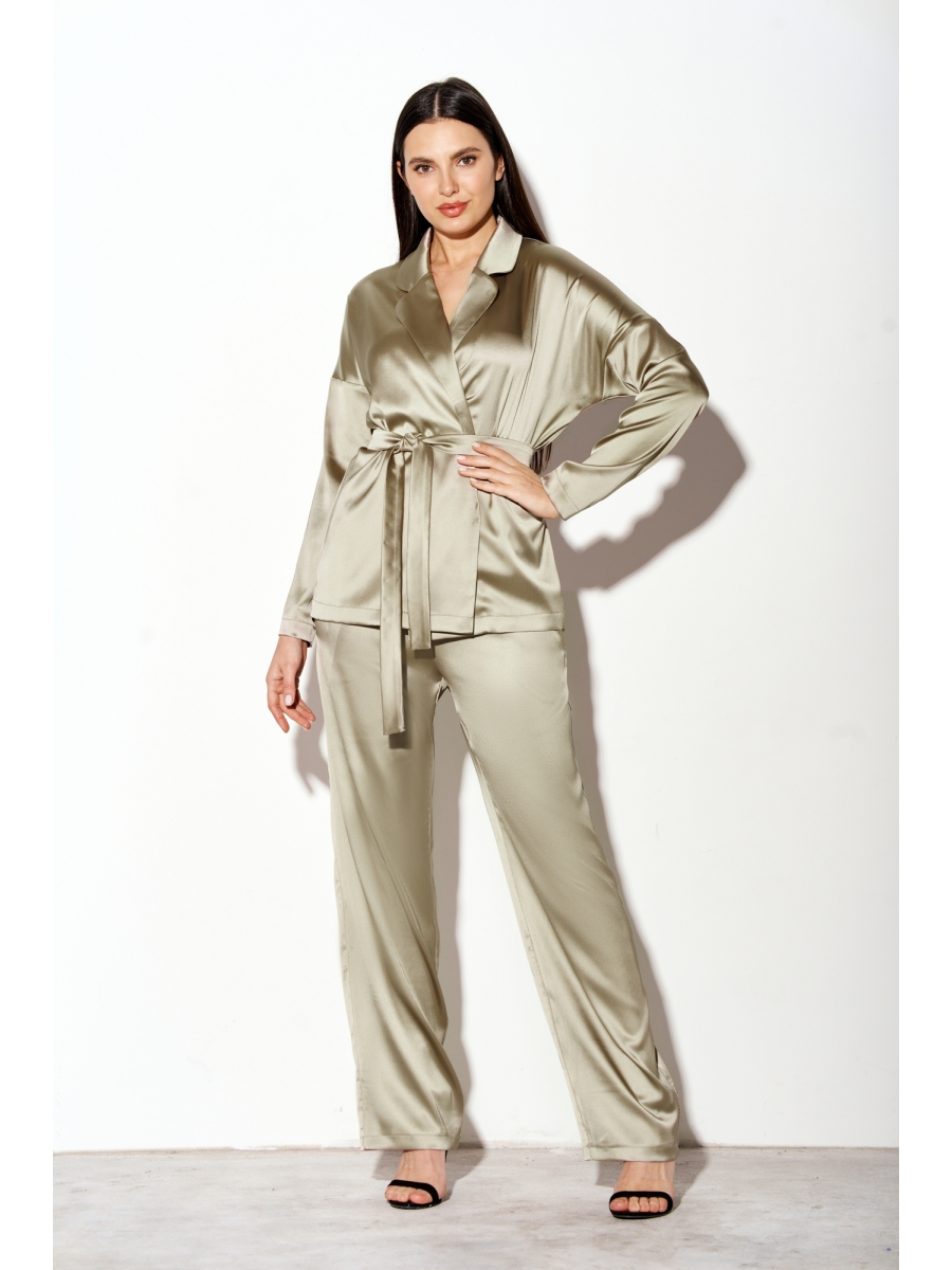 Костюм женский с брюками и рубашкой свободного силуэта выполнен из легкого струящегося шелк-сатина в пижамном стиле.