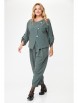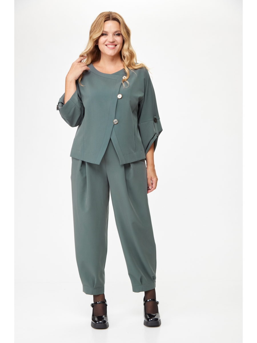Жакет укороченный с цельнокроенным рукавом длиной 7/8 с патой, закрепленной пуговицей. Перед жакета с ассиметричной косой застежкой на навесные петли с пуговицами.