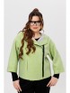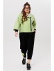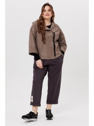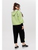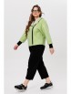 Жакет из буклированного однотона, брюки — однотонный вискозный трикотаж. Жакет укороченный с капюшоном и объемными рукавами, по переду застегивается на асимметричную застежку — молнию, имеются карманы. Спинка цельная. Края жакета, рукава, борта и капюшона с открытыми срезами и отделочной строчкой.