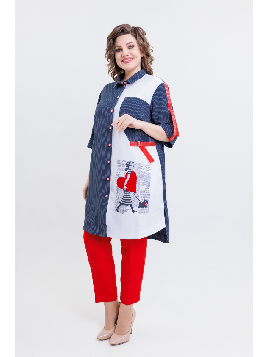 Шазюбль женский из текстильной ткани прямого свободного силуэта, выполнен из двух видов ткани. Левая часть передней полки из однотонной ткани с нанесением нижней части рисунка - печати. В верхней части настрочной карман ассиметричной формы. По передней полке застежка на петли - пуговицы контрастного цвета. В шазюбле обработаны карманы в боковых швах. Горловина оформлена отложным рубашечным воротником на стойке. Спинка прямого силуэта с кулисой в области талии и шнурками. Линия плеча чуть спущена, рукав втачного покроя, одношовный. Низ рукава оформлен отложным широким манжетом. Низ шазюбля фигурной формы, округлен к бокам, перед короче спинки на 7 см. В боковых швах разрезы по 14 см.