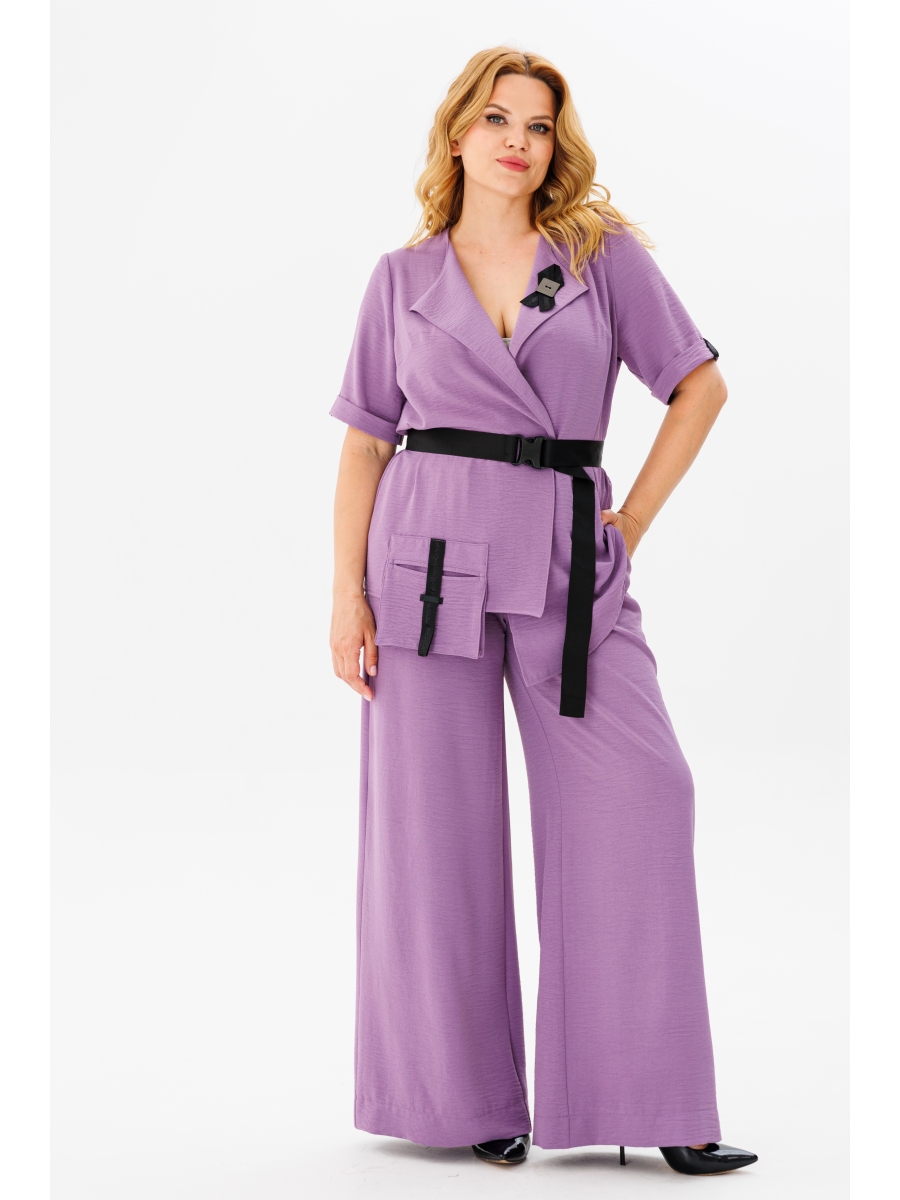 Жакет удлиненный с ассиметричным низом, распашной с раскладным бортом. Спинка с центральным швом. Рукав втачной одношовный с цельнокроеной манжетой. Жакет со съемным поясом на застежке-карабине. По правой стороне переда настрочной карман-книжка.