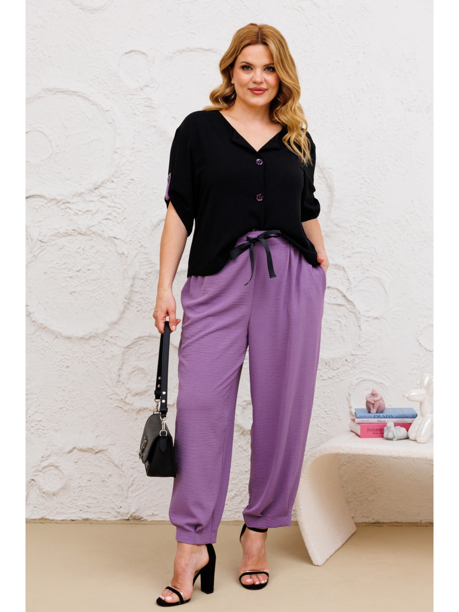 Брюки-шаровары, длиной 7/8, на притачном поясе с резинкой и шнуровкой, имеются два кармана в боковых швах, по низу брюк застрочены складки и широкая подгибка.