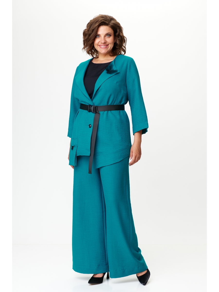 Жакет удлиненный с ассиметричным низом, распашной с раскладным бортом и застежкой на петли-пуговицы. Спинка с центральным швом. Рукав втачной одношовный. По правой стороне переда настрочной карман-книжка. Жакет украшен съемной брошью и дополняется съемным поясом на застежке-карабине.