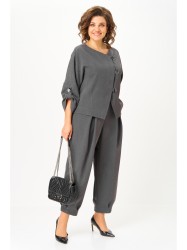 Универсальный костюм, который выглядит дорого и современно, но при этом дарит комфорт и лёгкость. Его можно носить как комплект или по отдельности: жакет с асимметричной застёжкой и акцентными пуговицами легко сочетается с джинсами, а брюки свободного кроя идеально смотрятся с блузой или футболкой.