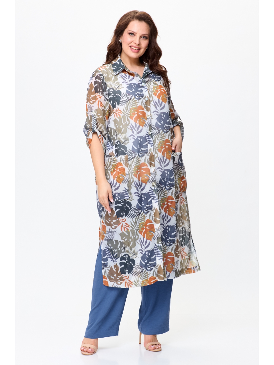 Свободная женская длинная блузка вытягивает силуэт и создает актуальный образ. Передние полочки с центральной сквозной застежкой на петли и пуговицы, с сорочечным воротником, с длинными рукавами на пате. На полочках блузона - функциональный карманы. По спинке кокетка, по бокам платья-разрезы. Свободный крой модели не сковывает движений, а ткань очень приятная телу. Плотность и, одновременно, легкость ткани позволяют носить данный костюм летом, весной или ранней осенью.