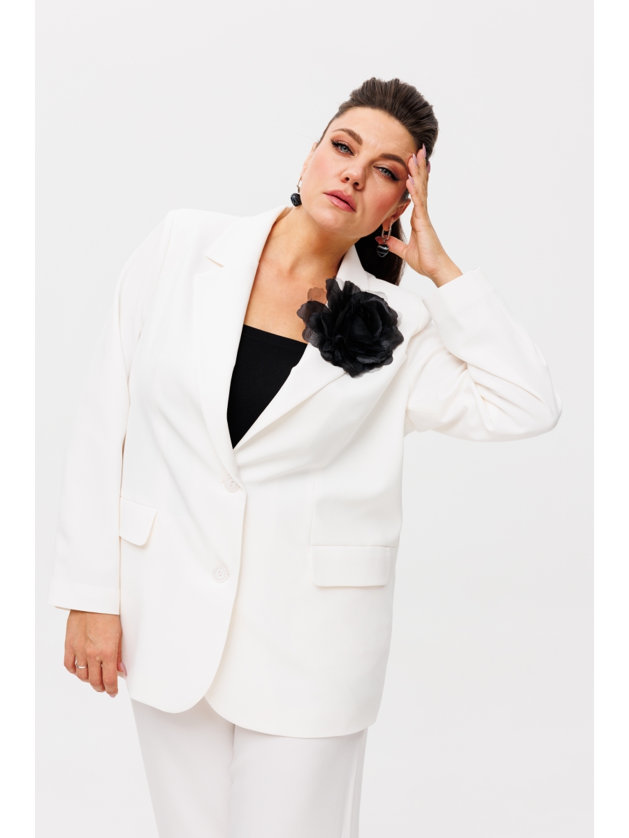 Брюки палаццо на резинке с карманами создают эффектный силуэт и придают образу легкость и грацию. Однобортный оверсайз жакет добавляет современную нотку и непринужденность, делая костюм идеальным выбором для любых случаев — от деловых встреч до вечерних прогулок.