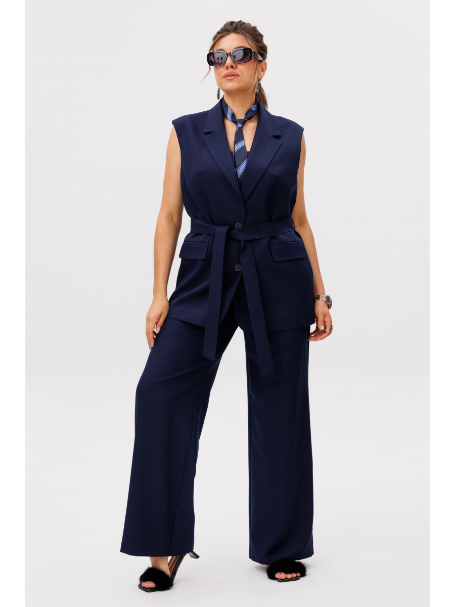 Этот элегантный костюм, состоящий из жилета и брюк, воплощает в себе утонченность и уверенность. Полуприлегающий силуэт жилета мягко подчеркивает линии фигуры, создавая гармоничный баланс между строгостью и женственностью. Однобортная застёжка на петли и пуговицы придает образу аккуратность и завершенность, а отложные лацканы воротника добавляют ноту классической сдержанности.