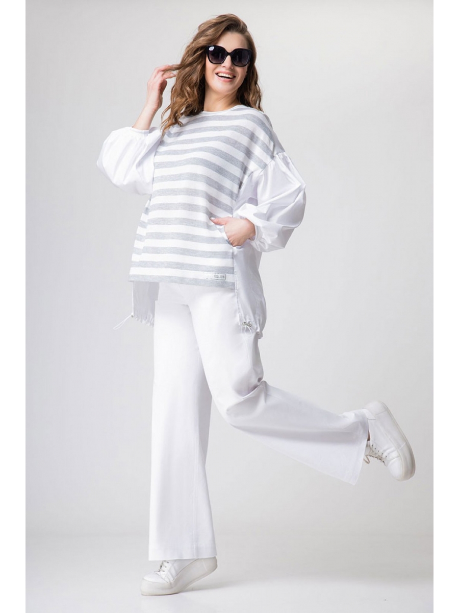 Блузка свободного силуэта выполнена из хлопковой ткани в сочетании с трикотажным полотном, вырез горловины округлый обработан мягкой обтачкой с довязом, плечо спущенное, рукав втачной со сборкой по пройме и по низу на трикотажной манжете из довяза. По спинке кокетка с центральной складкой, внизу собрана на кулису с фиксаторами регулирующими ширину по желанию, декором служат две небольшие печати по полочке и спинке Брюки женские на притачном поясе, джоггеры зауженные к низу, выполнены из хлопкового джинса. Пояс на широкой резинке со шнуром и наконечниками, по центру передних половинок имитация застёжки и карманы, по задним половинкам - кокетка и накладные карманы.