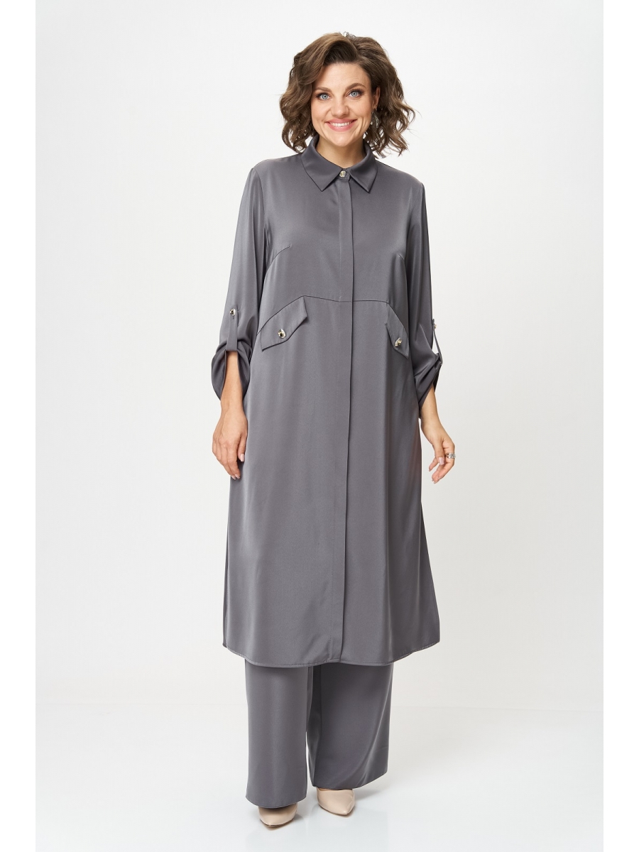 Туника свободного облегания, с центральной потайной застежкой, воротником рубашечного типа, с фигурными подрезами по линии талии. По переду ниже подреза клапаны, в боковых швах карманы и высокие разрезы, рукав длинный с патой. Пата позволяет регулиовать длину рукава. Туника украшена декоративными пуговицами.