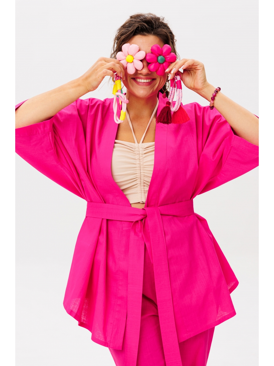 Кимоно свободного кроя с фигурным запахом мягко драпируется, подчёркивая силуэт, но не сковывая его. Рукав 3/4 с широкой манжетой добавляет динамики, а отсутствие застёжек делает образ ещё более непринуждённым. Съёмный пояс позволяет варьировать степень выразительности.