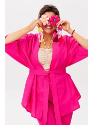 Кимоно свободного кроя с фигурным запахом мягко драпируется, подчёркивая силуэт, но не сковывая его. Рукав 3/4 с широкой манжетой добавляет динамики, а отсутствие застёжек делает образ ещё более непринуждённым. Съёмный пояс позволяет варьировать степень выразительности.