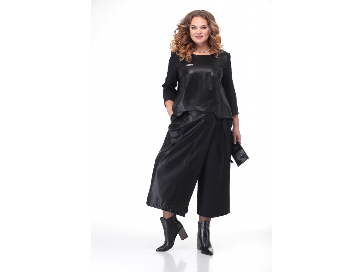 Стильный,модный,оригинальный женский комплект состоит из брюк "килоты" и джемпера из 2-х видов ткани.По переду джемпера ткань из эко-кожи, на хлопковой основе, с декоративной апликацией.