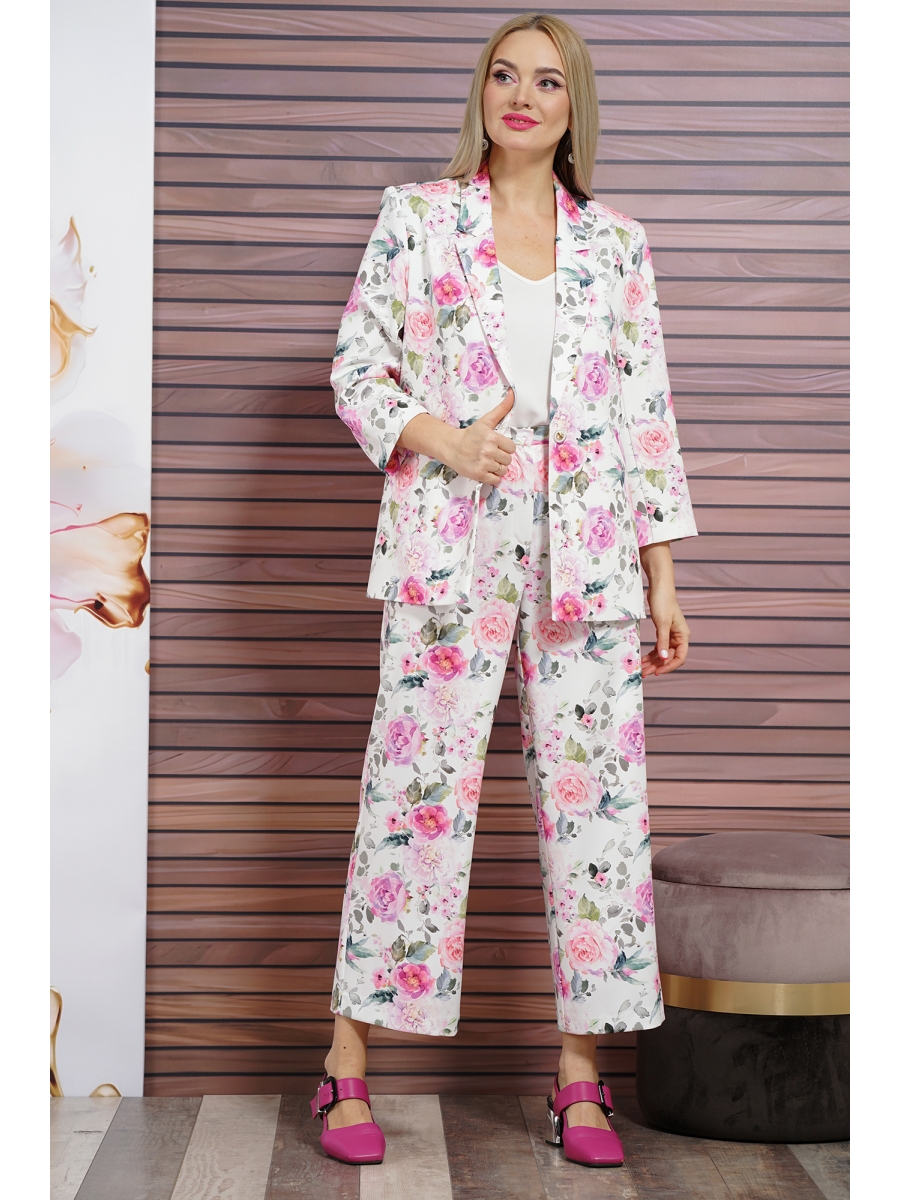 Очень красивый костюм! Купила из-за нежного цветочного принята. Жаль, брюки коротки на мой рост 176 см.