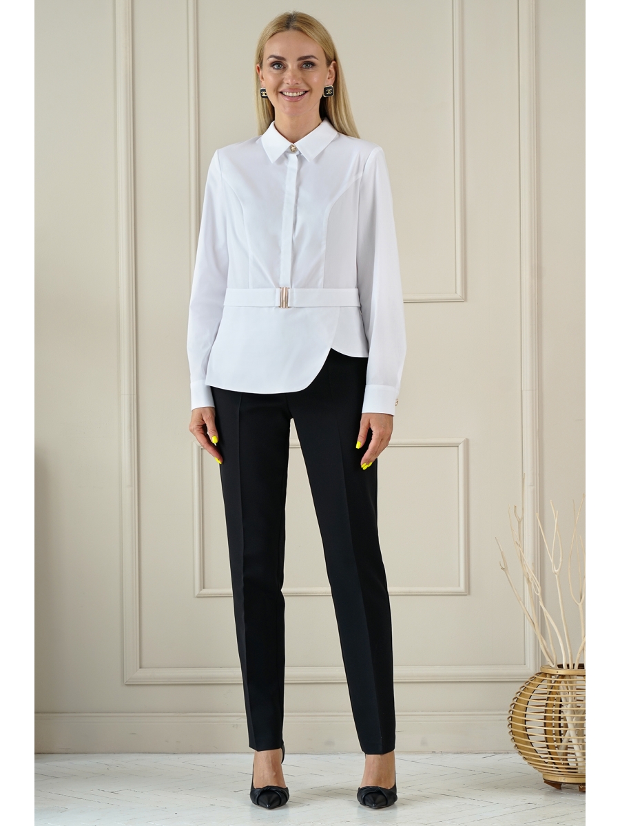 Блузка женская полуприлегающего силуэта, отрезная по линии талии, с притачным поясом и баска разно-уровневая. Застёжка с цельнокроеной потайной планкой на петли и пуговицы и потайную тесьму-молнию в левом боковом шве. С отлетным поясом по переду с декоративной пряжкой Перед с рельефными швами. Спинка с талевыми выточками. Рукава втачные, одношовные, длинные понизу с разрезом двумя мягкими складками и притачными манжетами застёгивающиеся на петлю и пуговицу Воротник отложной с отрезной стойкой застёгивающаяся на петлю и пуговицу.