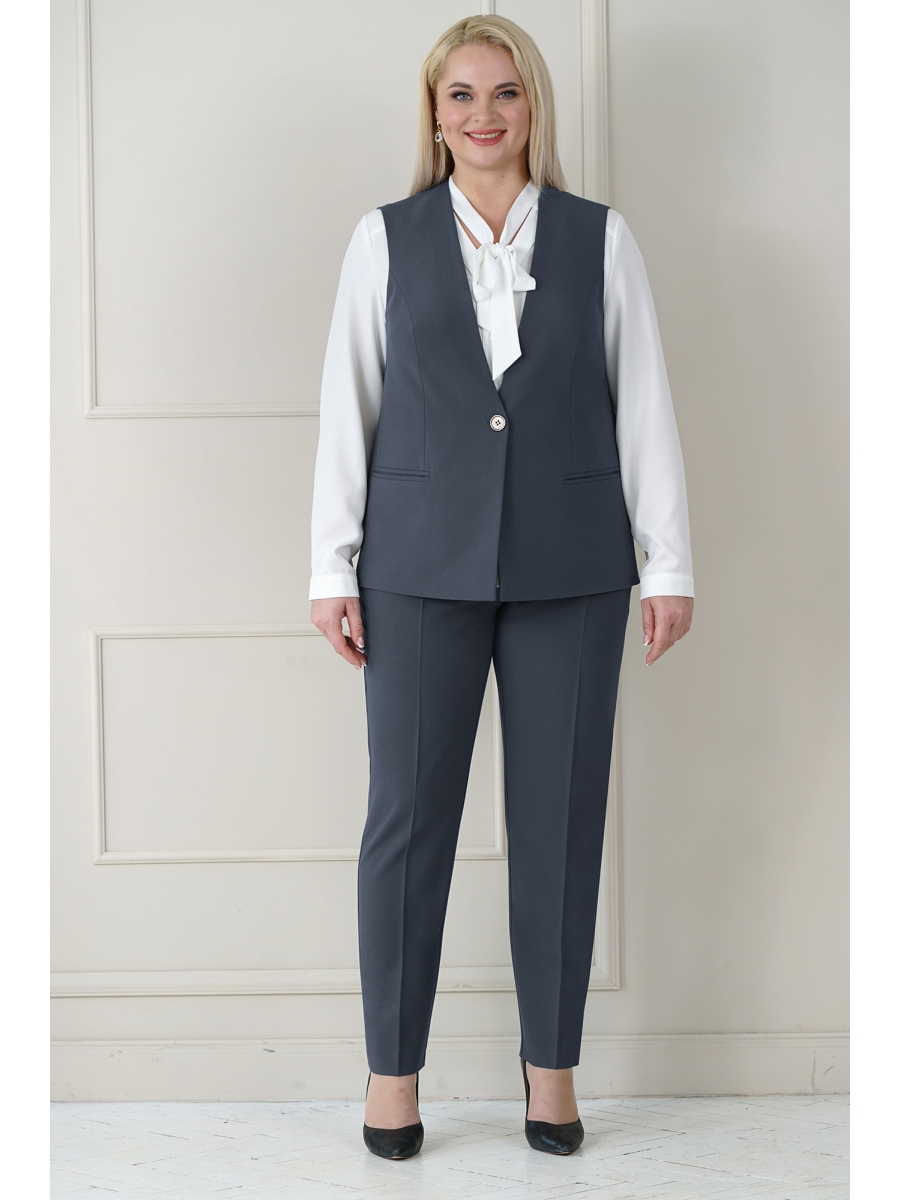 Комплект женский 3-х предметный состоящий из жилета, блузки брюк. Жилет полуприлегающего силуэта, на подкладке, с центральной застёжкой на петлю и пуговицу, с отрезными бочками со смещёнными боковыми швами, с поясом. Перед с рельефными швами и прорезными карманами с двумя обтачками. Спинка со средним швом. Брюки длинные, со сгибом, на притачном поясе по боковым на резинке. Застежка типа «гульфик» в среднем шве на тесьму-молнию и петлю и пуговицу по поясу. Передние части с имитацией косых карманов. Задние части с талевыми выточками. Блузка прямого силуэта с застёжкой по притачной планке на петли пуговицы, с V–образным вырезом.