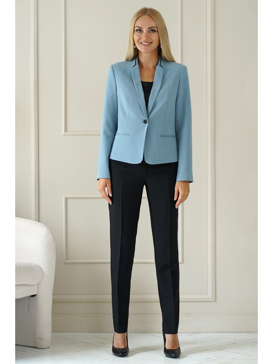 Жакет женский полуприлегающего силуэта, на подкладке, с отложными лацканами, с застёжкой на пробивную петлю и пуговицу. Перед верху с притачными кокетками с талевыми фигурными выточками и рельефными швами, с прорезными карманами с двумя обтачками. Спинка с конструктивным подрезом выходящий от линии проймы и заканчивающийся выточкой, со средним швом и рельефными швами. Рукава втачные, двухшовные, длинные. Воротник комбинированная стойка.