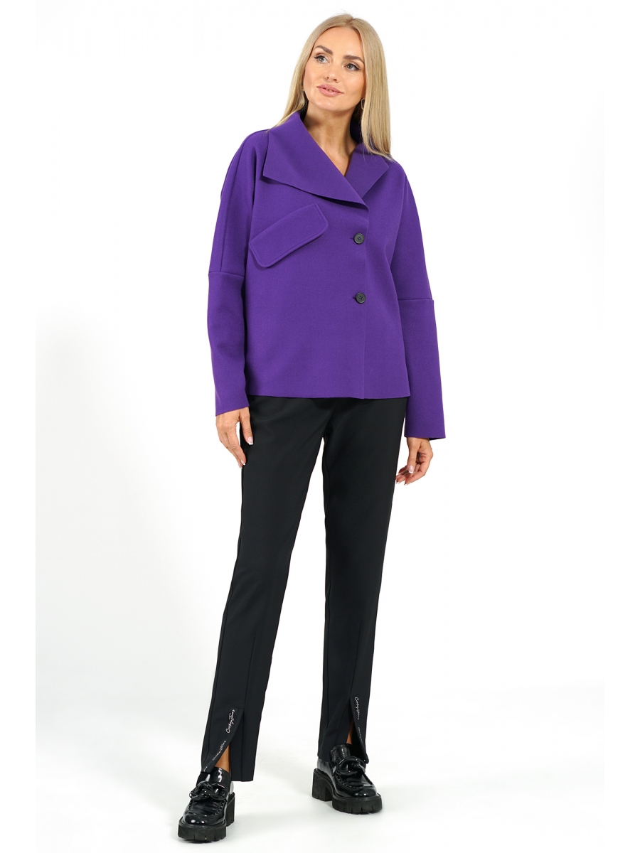 Жакет женский прямого свободного силуэта, со спущенной линией плеча, со смёщенной застёжкой влево на петли и пуговицы. Перед декорирован по правой части клапаном имитирующий прорезной карман с косым входом. Спинка со средним швом. Рукава втачные, одношовные, длинные. Воротник отложной формы «апаш». Брюки женские прилегающего силуэта, длинные, на притачном поясе с пятью шлёвками, с застёжкой типа «гульфик» на тесьму-молнию и на петлю и пуговицу по поясу. Передние части с косыми боковыми карманами, по центру низа шлица переходящая верх в выточку и с отделочной тесьмой вдоль шлицы. Задние части с талевыми выточками.