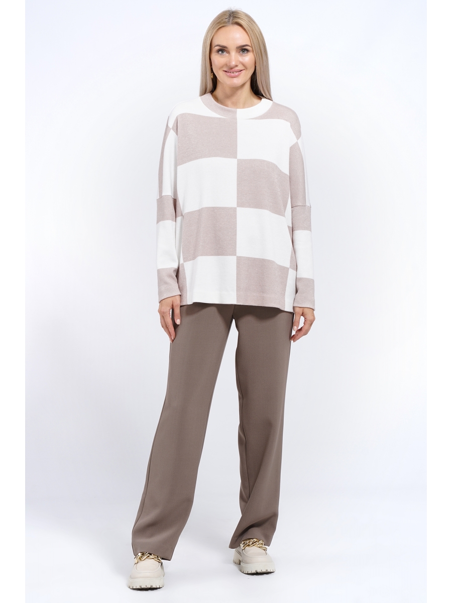 Брюки женские прямого силуэта, длинные, со сгибом, на притачном поясе, Застежка на тесьму-молнию типа «гульфик» и по краю пояса на петлю и пуговицу. Передние части с имитацией кармана с пришивными отделочными пуговицами. Задние части с талевыми вытачками.