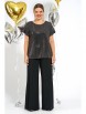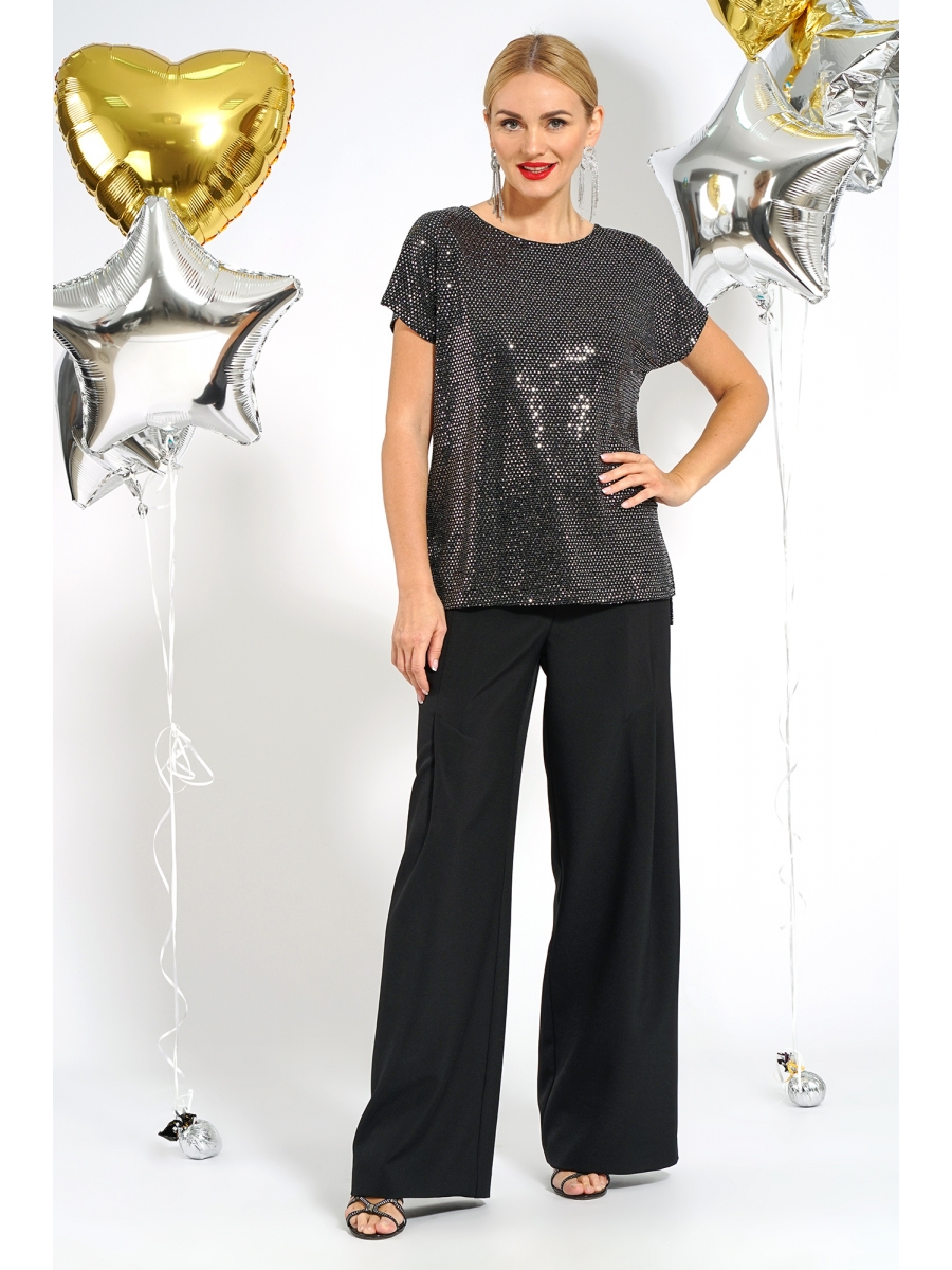 Брюки полуприлегающие по бёдрам и талии, книзу расширенные, на притачном поясе, застёжка по среднему шву переда на тесьму-молнию и петлю и пуговицу по поясу. Передние части с мягкой застроченной складкой от линии талии и чуть ниже линии бёдер. Задние части с талевыми выточками.