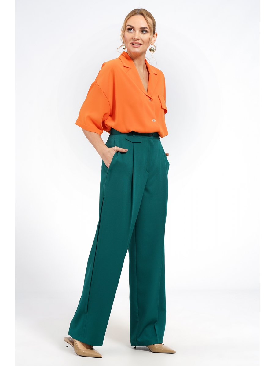 Брюки свободные в бёдрах книзу чуть заужены, со сгибом, на притачном поясе с пятью шлёвками, с застёжкой по среднему шву переда на тесьму-молнию типа «гульфик» и на петлю и пуговицу по поясу. По боковым швам встречная складка, фиксируемая отделочной строчкой, в боковых швах карманы. Передние части с мягкой складкой и клапаном в шве соединения с поясом по правой части. Задние части с талевой выточкой.