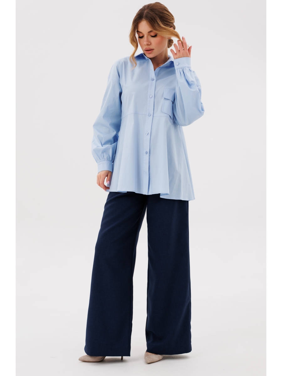 Рубашка женская А-силуэта отрезная по линии талии. По переду слева декоративные клапаны. Рукав длинный на манжете. Низ фигурный.
