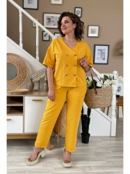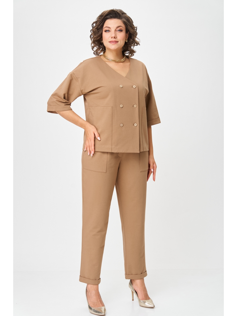 Джемпер женский из трикотажной ткани, прямого силуэта. По переду джемпера расположены настрочные карманы. Спинка прямая. Спущенное плечо. Рукав 3/4. Вырез горловины треугольный. Застежка двубортная на петлях-пуговицах.