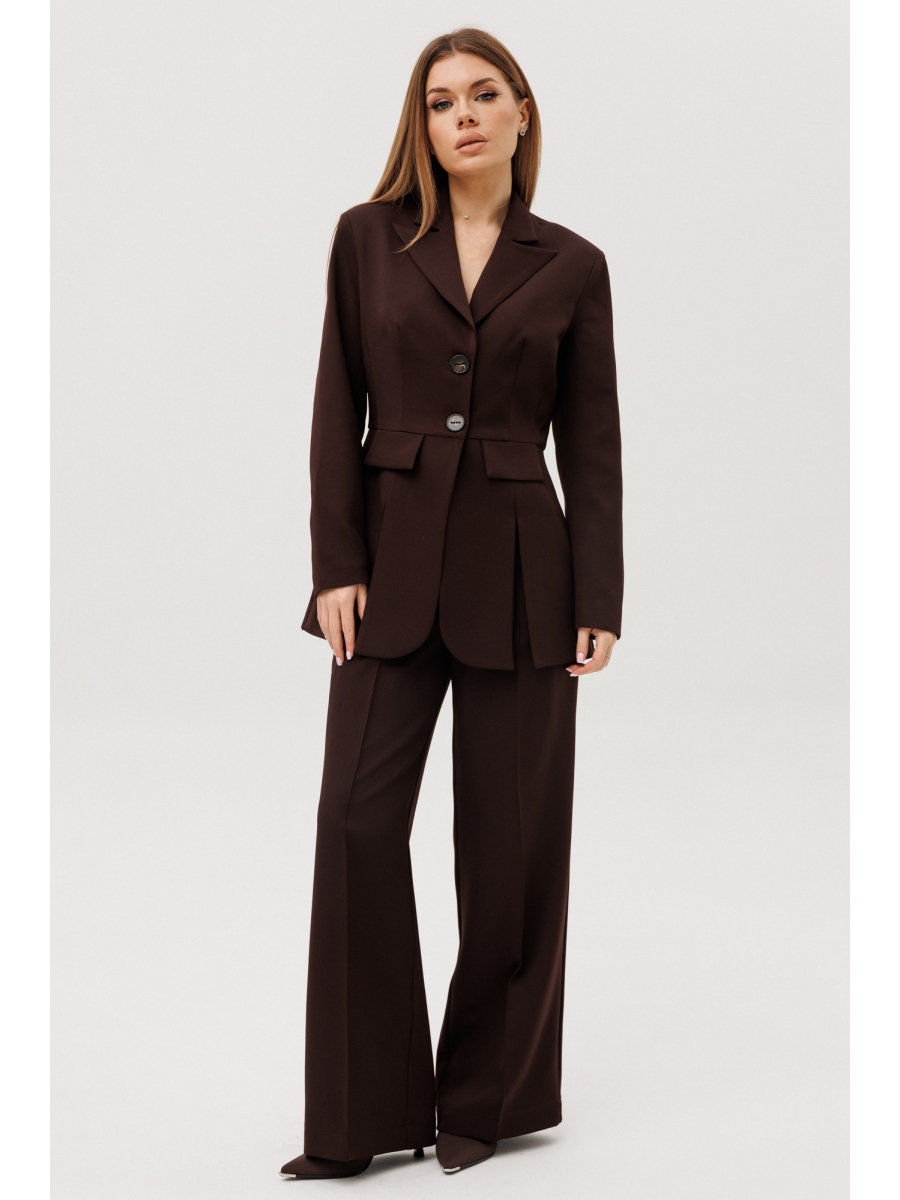 Жакет женский прилегающего силуэта, отрезной по линии талии. По переду в нижней части жакета разрезы. По линии талии декоративные клапаны. Рукав втачной длинный. Жакет на подкладке.