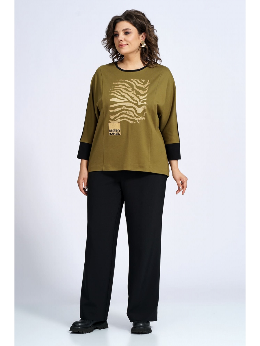 Блузон прямого, свободного силуэта, комбинированный из двух цветов трикотажного полотна, с фигурной линией низа. Перед с рельефными швами. Спинка со средним швом. Рукава цельнокроеные, длиной ¾, понизу с притачными манжетами. По горловине втачная бейка. Декорирован по переду печатью, нашивкой и нашивкой по спинке.