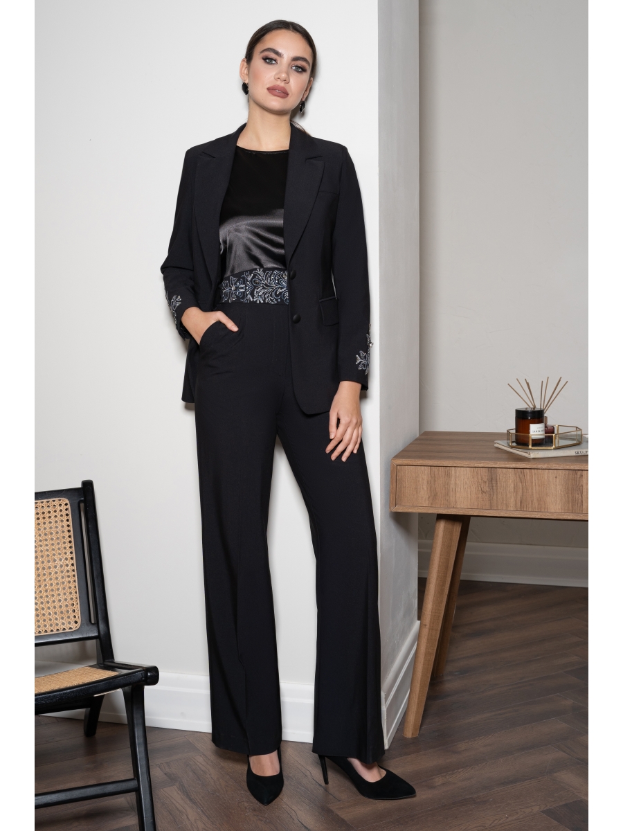 Костюм женский трёхпредметный состоит из удлиненного жакета полуприлегающего силуэта с вышивкой на рукаве, брюк и блузы.
