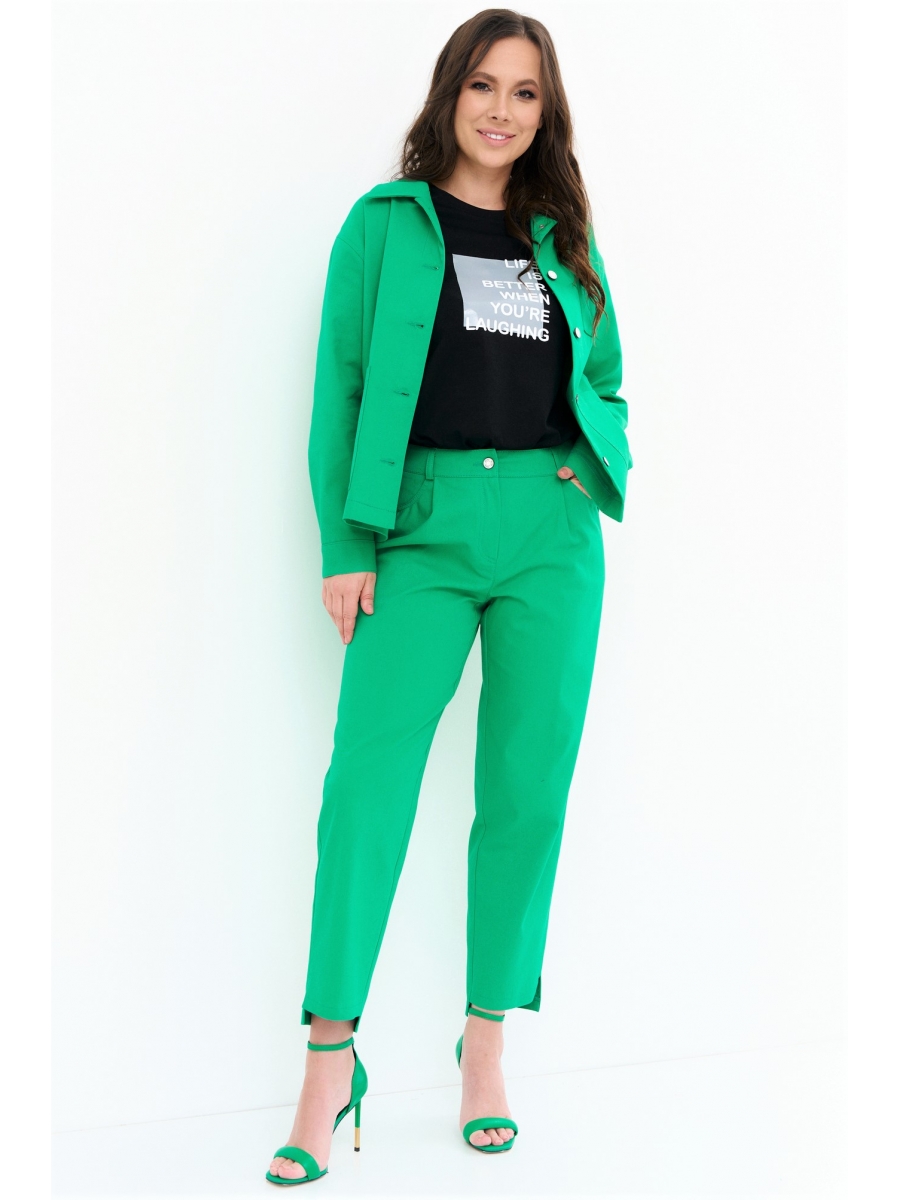 Стильный комплект, состоящий из жакета, блузы и брюк. Жакет свободного кроя, без подкладки, с центральной застежкой на металлические пуговицы. Рукав спущен, дополнен манжетой. Блуза свободного кроя, с коротким рукавом. Выполнена их хлопкового трикотажа. Дополнена термоаппликацией. Брюки свободного кроя с притачным поясом, слегка заужены книзу. Дополнены боковыми карманами. Брюки с застежкой на молнию и пришивную пуговицу. Брюки и жакет выполнены из хлопкового легкого джинса.